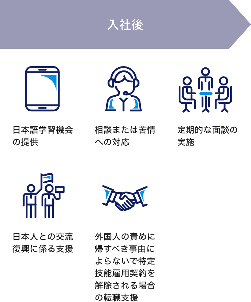 受入企業は、下記の様な支援を行うことが義務化されていますが、当社が全て支援します。